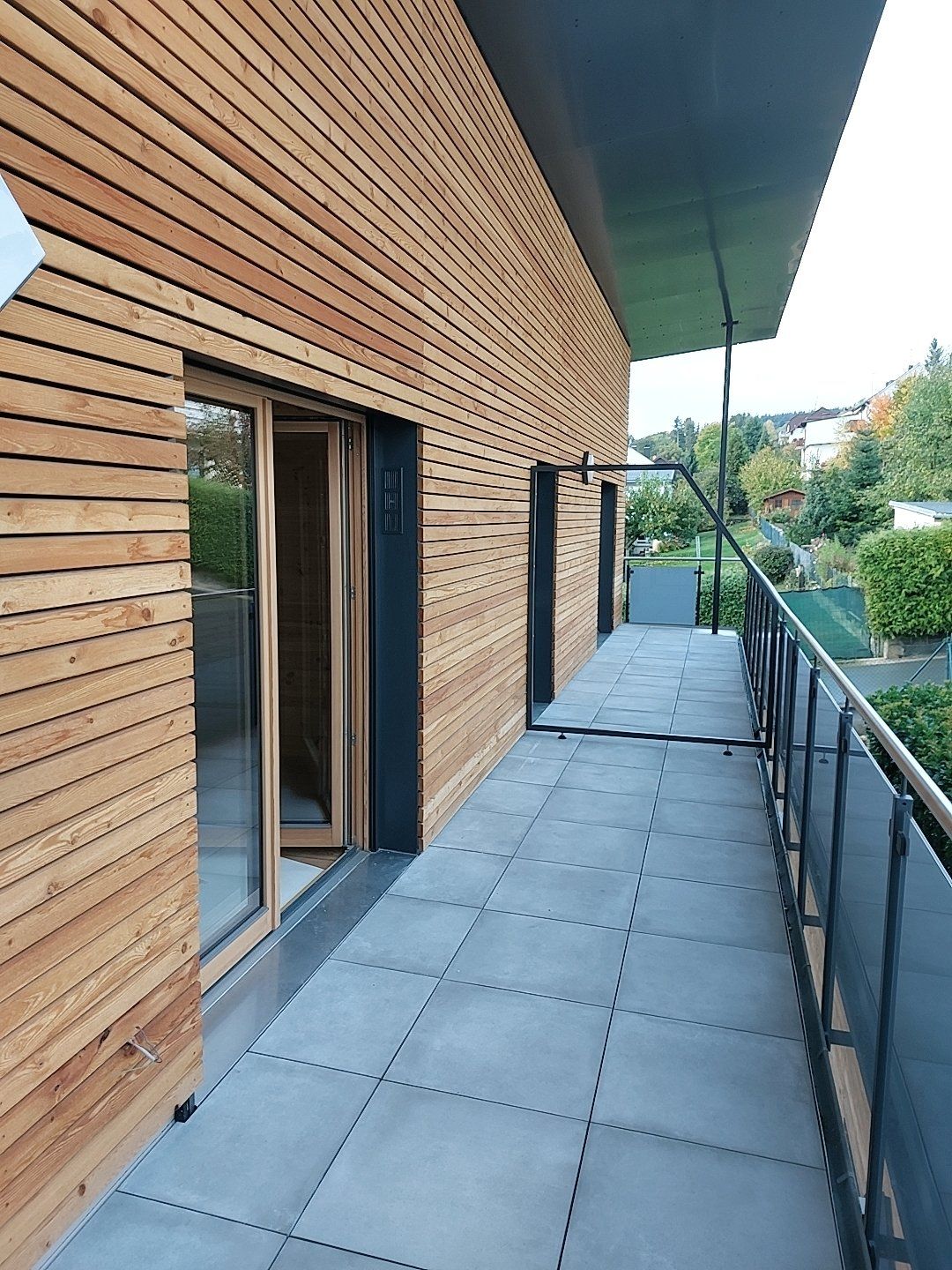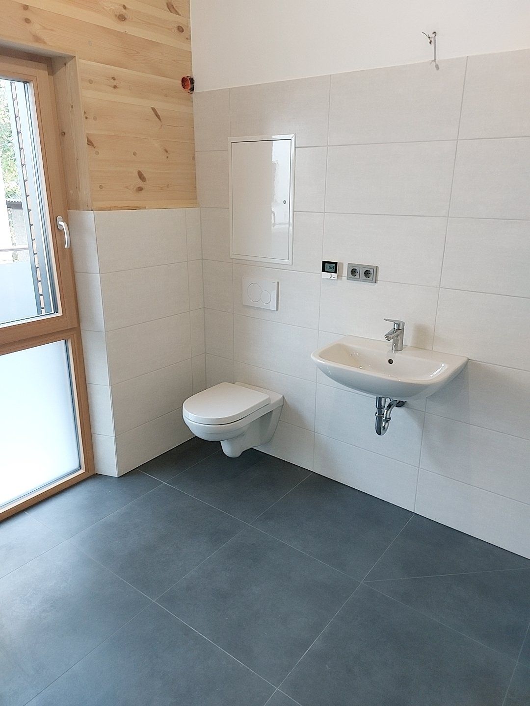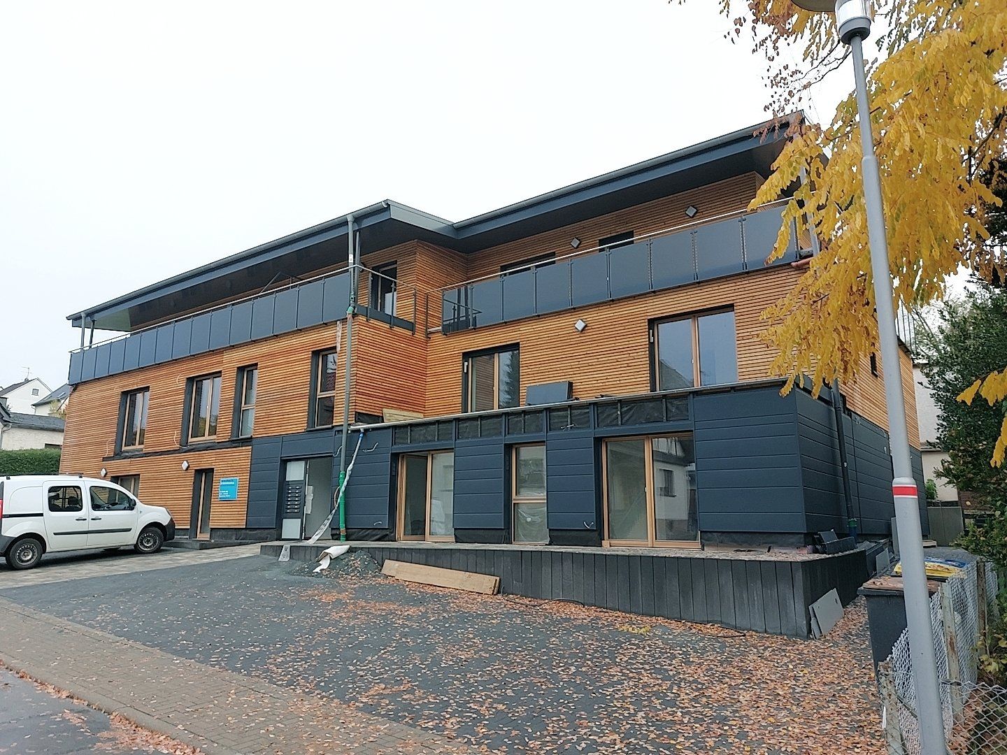 Die Baustelle neigt sich mit zügigen Schritten der Fertigstellung entgegen. Der moderne Aufzug von Tyssen ist vom TÜV abgenommen und funktioniert perfekt. Die schicken grauen Wohnungseingangstüren sind fast alle eingebaut. Die stufenfreien Bäder sind dunkelgrau und weiß gefliest und harmonieren mit der warmen Austrahlung des Holzes, die Sanitärobjekte von Villeroy & Boch sind installiert. Der Parkettboden ist fertig, die hochwertig eingebauten Holzfenster werden gerade feinjustiert, die Solaranlage mit allen Wechselrichtern ist installiert, der Batteriespeicher wird voller Spannung erwartet, die Aussenfassade hat neben dem Lärchenholz eine hochwertige Prefa Aluminium Verkleidung erhalten, zwei vorgehängte Balkone werden in Kürze montiert, die Pflasterarbeiten sind so gut wie fertig, die Regenrinnen werden erwartet.
